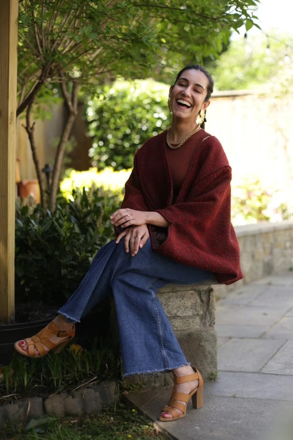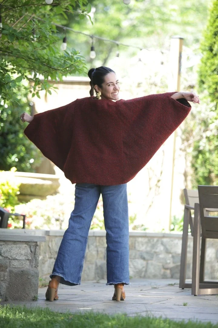 Lucy jacket in red/chocolate wool boucle. Self piping. Bemberg rayon lining.