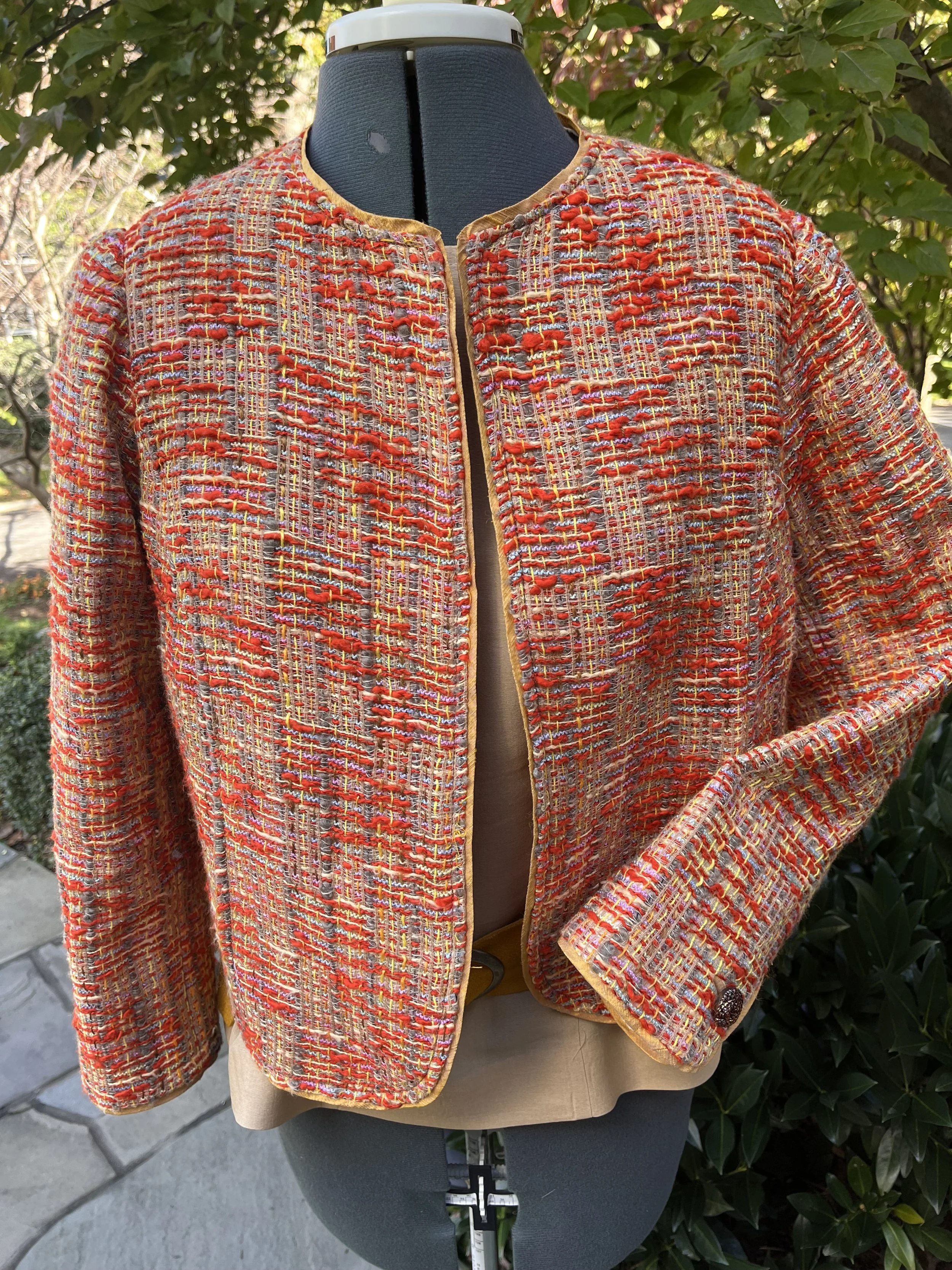 Dolman sleeve jacket in venetian red and cream wool tweed; accent piping in cream and peach linen