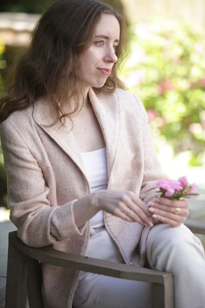 Semi-fitted jacket in pale pink raw silk. Bemberg rayon lining.