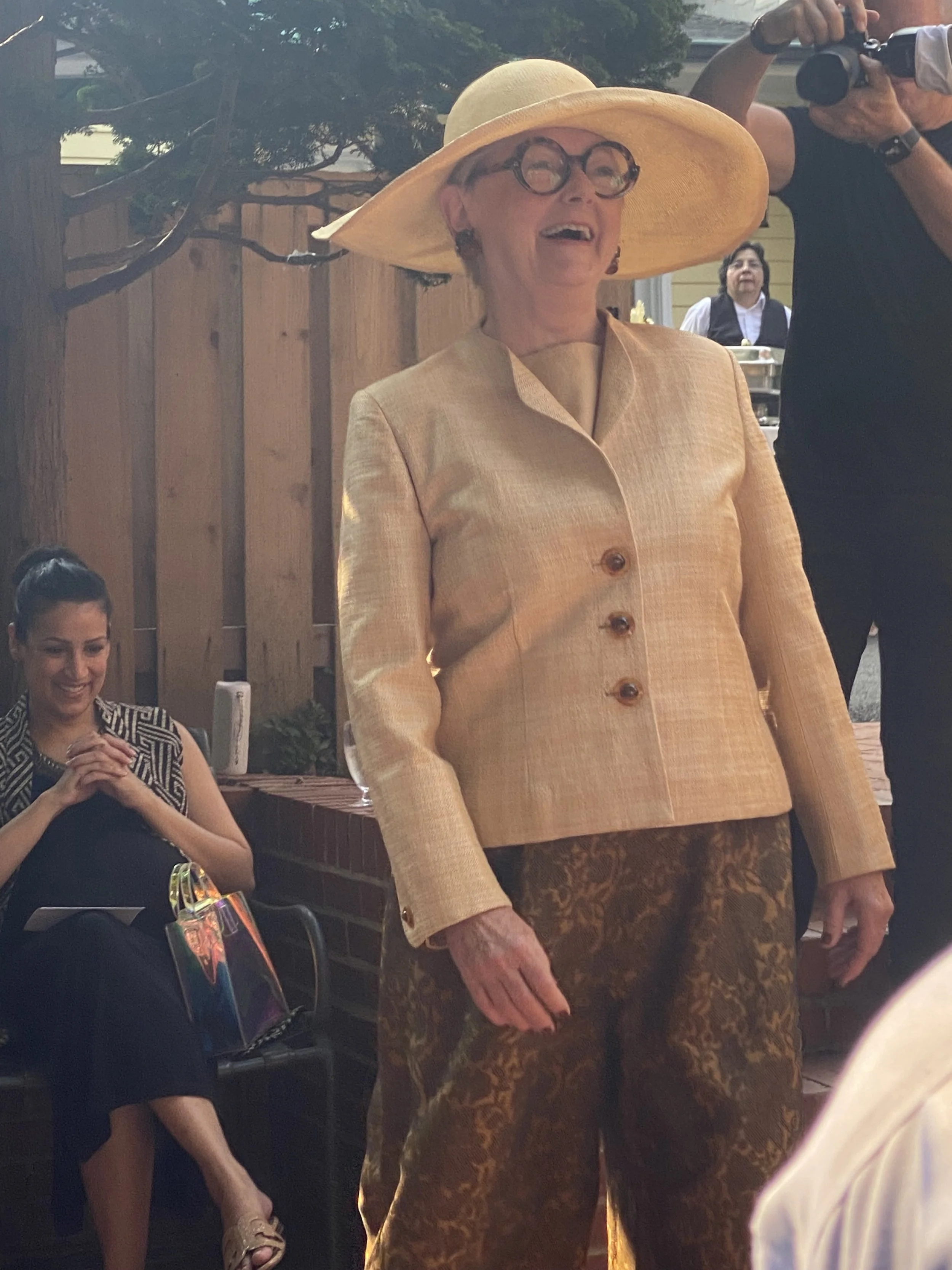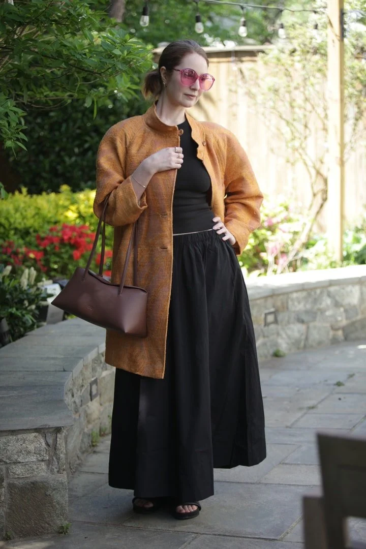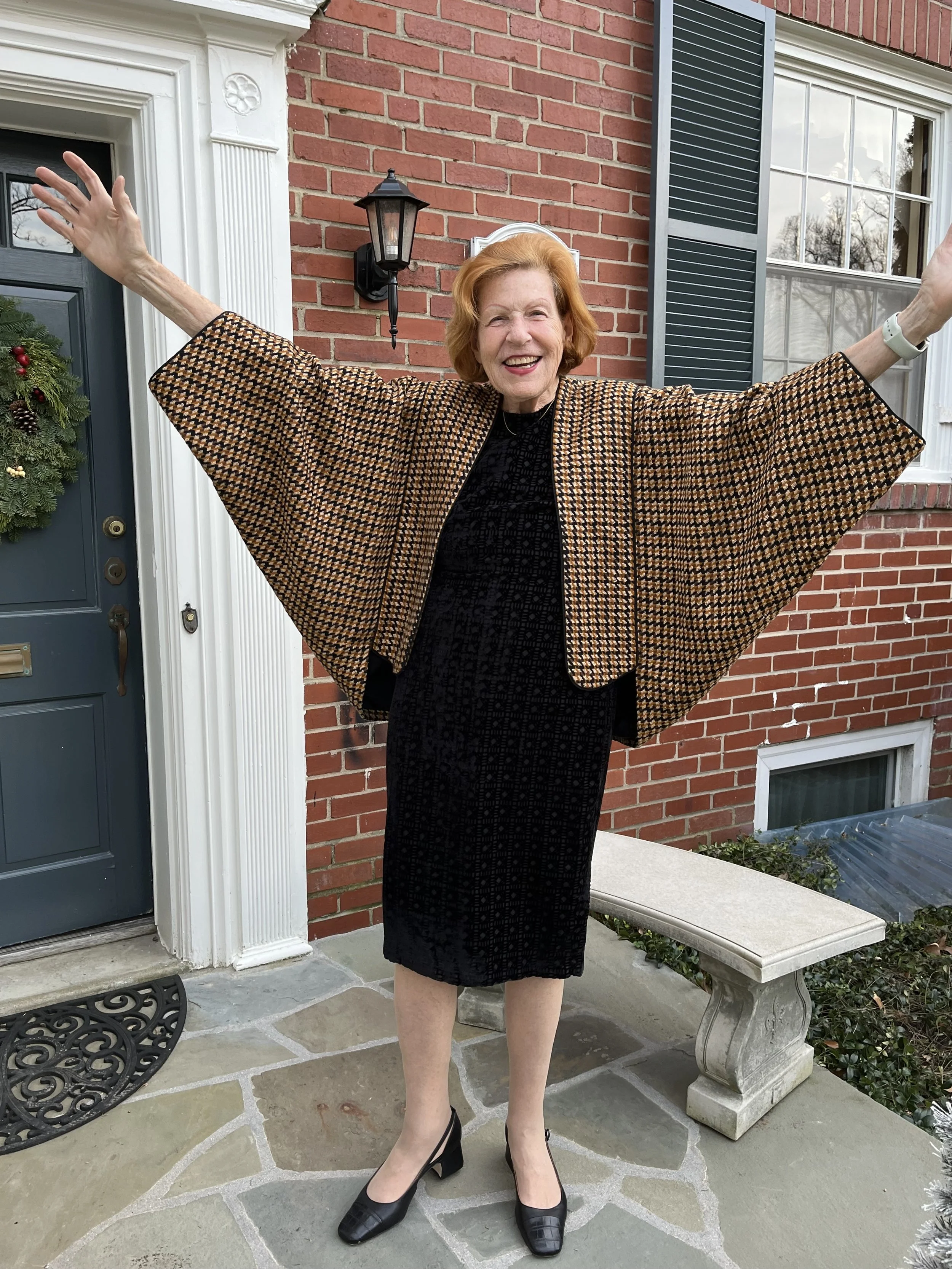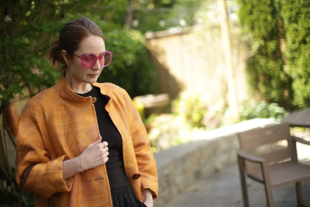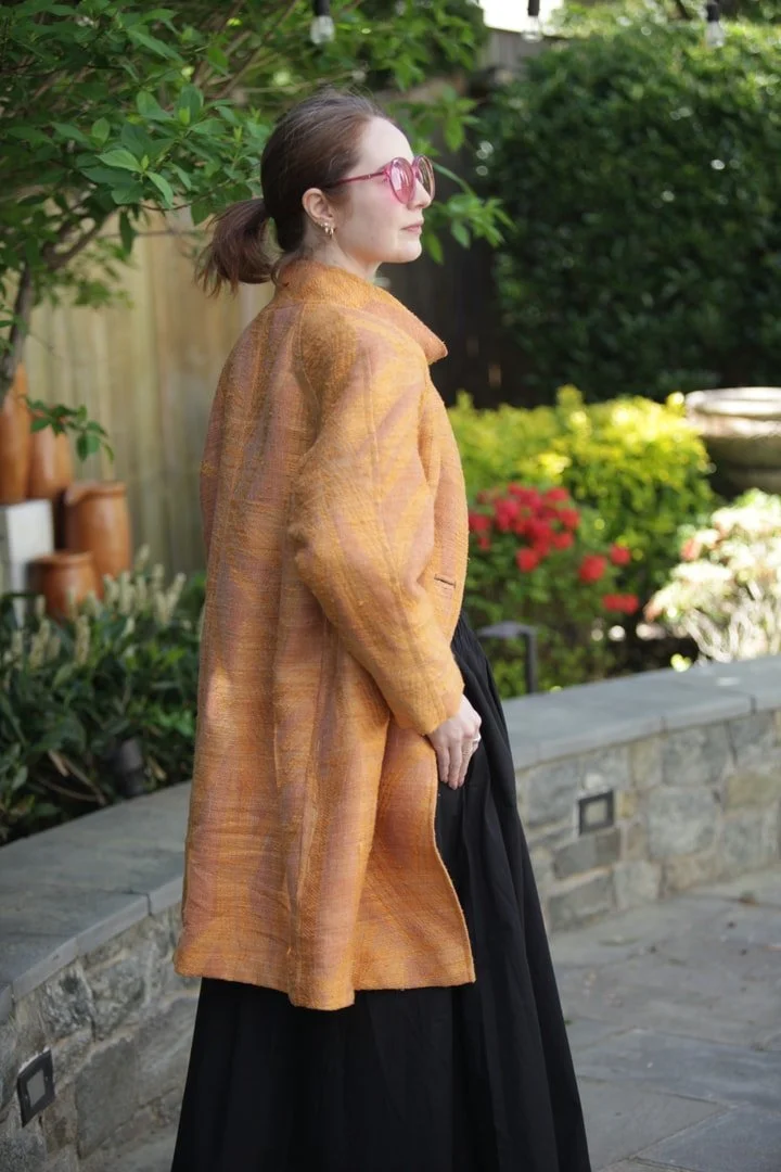 Golden sunshine Ada coat in wool blend pattern woven fabric. Antique metal buttons. Bemberg rayon lining. Available for sale. Details on request.