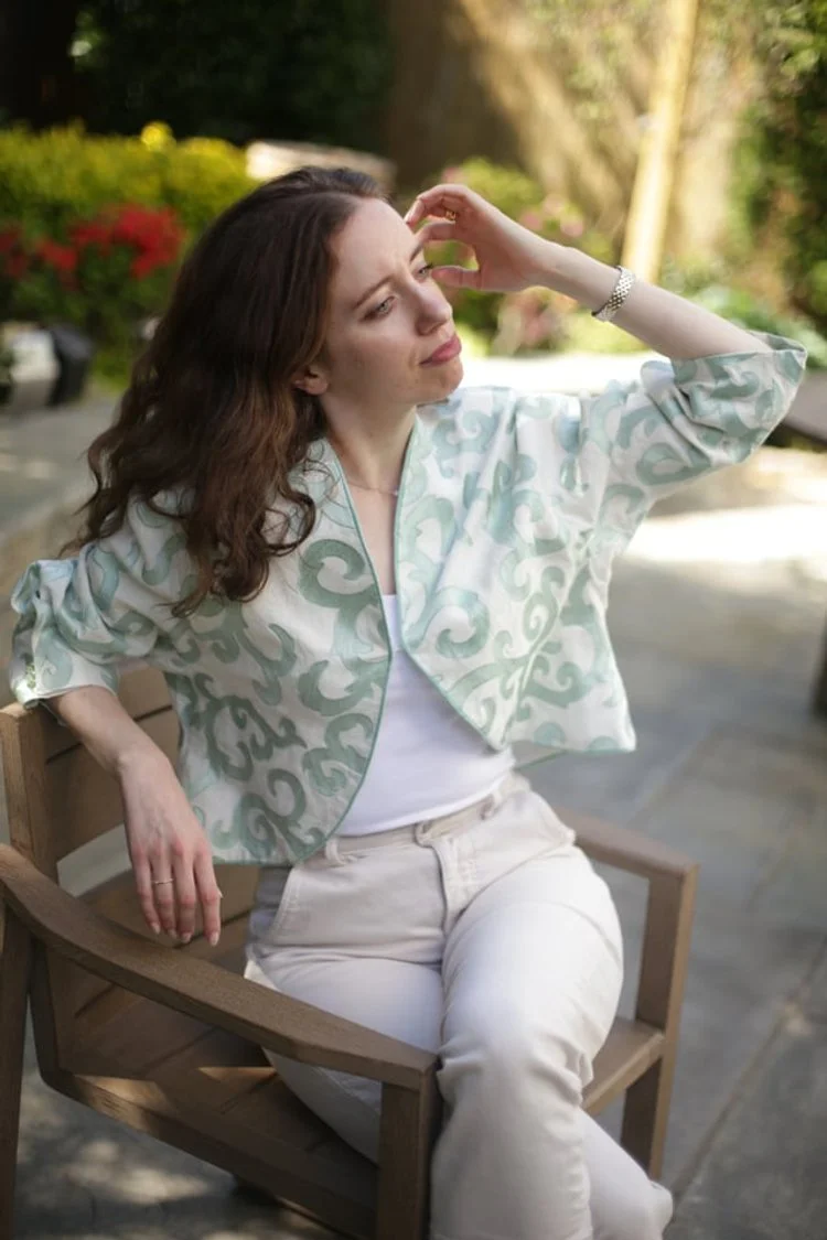 Summer jacket, appliqued green on white linen. Green linen piping, Antique glass button and loop closing on sleeves.